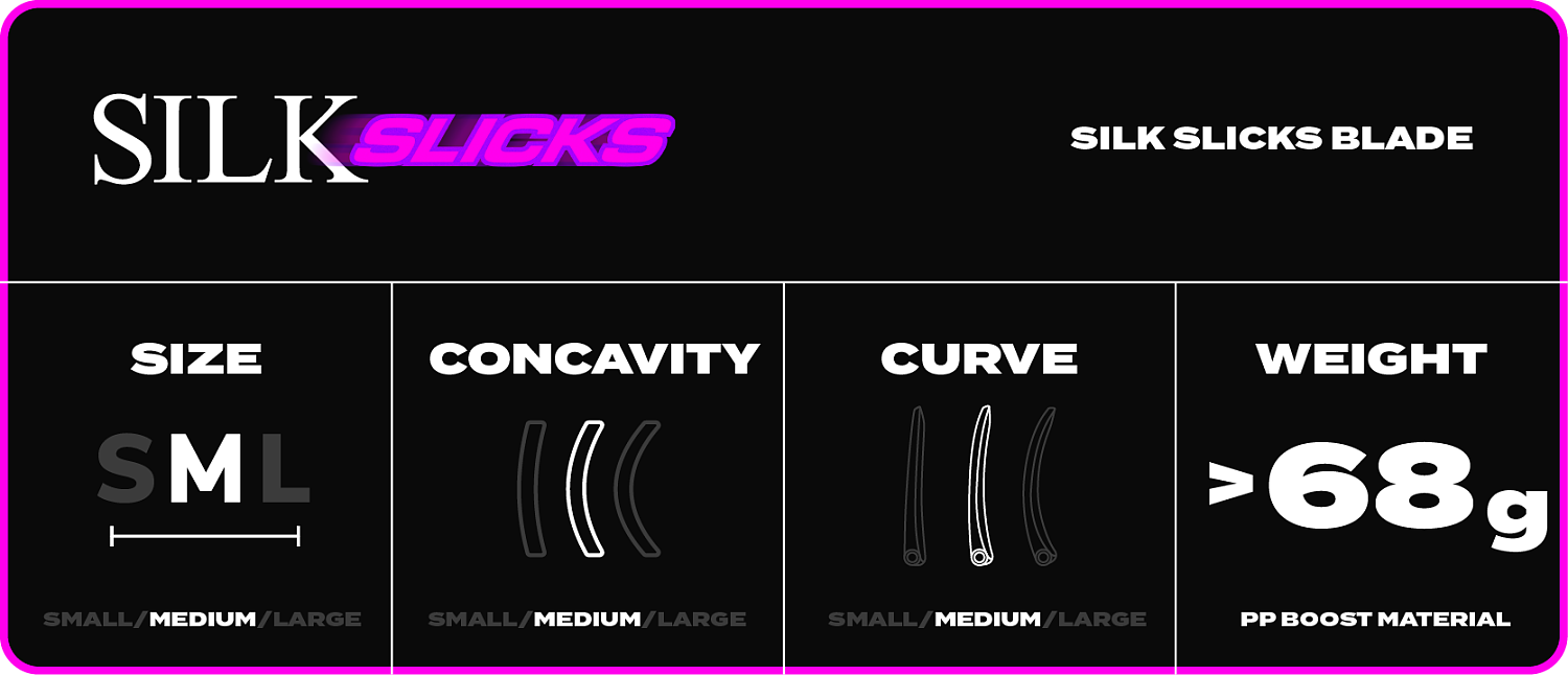Nová revolučná čepeľ SILK SLICKS – najjemnejšia čepeľ SILK je teraz vybavená technológiou SLICKS! Hodvábne hladký materiál PP Soft (PPS) v kombinácii s klzkým materiálom PE tvorí perfektné spojenie pre rýchle a hladké ovládanie loptičky. Technológia SLICKS z PE plastu poskytuje lepší sklz ako pri bežnej PP čepeli na každom povrchu, pričom zachováva jemný a citlivý kontakt materiálu PP Soft.